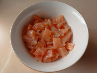 Соленую горбушу очистите от костей и шкурки. Мякоть нарежьте кубиками. Обязательно проверьте рыбу на наличие костей - даже в филе могут встречаться косточки. Косточки можно почувствовать, проведя пальцами по поверхности рыбы. Важно попробовать рыбу на соль. Если рыба слишком соленая замочите ее в молоке или холодной воде на 20-30 минут, это смягчит вкус. После замачивания промокните кусочек рыбы бумажным полотенцем, чтобы убрать излишки влаги.