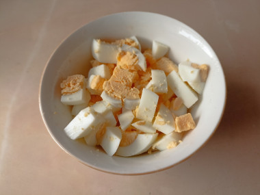 Очистите яйца и нарежьте кубиками. О том как проверить их на свежесть, а также дополнительные советы по варке читайте внизу.