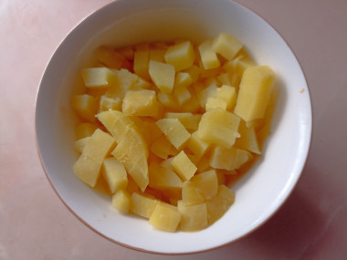 Картофель, очистите и нарежьте аккуратным кубиком.