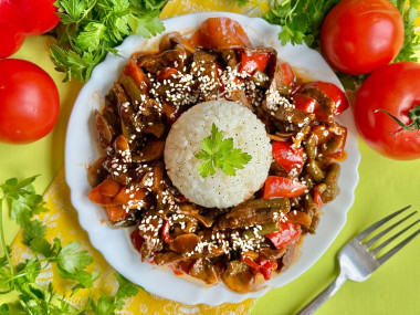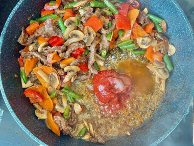 Тушите говядину в кисло сладком соусе с овощами еще около 25 минут - до полной готовности.