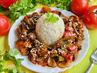 Приготовила рецепт азиатской кухни - говядина в кисло сладком соусе.