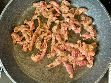 В сковороду налейте масло, разогрейте, выложите говядину с маринадом и обжарьте на умеренно сильном огне до появления румяной корочки. Жарить до готовности не надо, главное, чтобы мясо зарумянилось сверху. Как правильно выбрать сковороду и на каком масле лучше жарить, читайте в отдельных статьях под шагами.