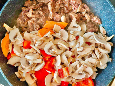 Добавьте к мясу стручковую фасоль, болгарский перец и грибы.