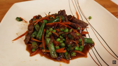 Как сделать говядину в кисло сладком соусе? Подготовьте ингредиенты. Так как мясо будет тушиться, то можно выбирать любую говядину, но учтите, что в зависимости от части туши, а также возраста животного время тушения может увеличиться или уменьшиться. Говядину можно заменить на свинину или курицу. Стручковую фасоль можно взять свежую или замороженную (предварительно разморозьте её перед приготовлением и слейте излишки жидкости).