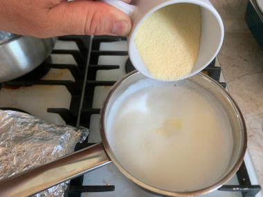 Поставьте посуду с молоком на небольшой огонь и доведите его до кипения. Советую не отходить все это время от плиты, иначе молоко может убежать. Как только появятся первые пузырьки, тонкой струйкой и при постоянном размешивании всыпьте в молоко манку.