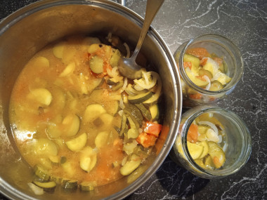 Порезала все овощи по описанию в рецепте и смешала. Добавила специи по списку. Отварила, разложила и закатала. Что может быть проще) Банки я также, как и автор, ошпариваю кипятком, мне так удобнее)
