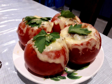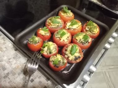 Выложите сверху помидор. Помидоры сложите в жаропрочную форму. Запекайте в духовке при температуре 200 градусов 15-20 минут, не больше, чтобы помидоры не потеряли форму. Точное время зависит от вашей духовки. Узнать об особенностях работы духовок можно, прочитав отдельную статью, ссылка в конце рецепта.