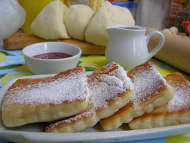 Аппетитные и красивые пышки жаренные на сковороде покорили наше сердце! Если не добавлять сахар и сахарную пудру, то это будет отличная альтернатива хлебу. Такие пышки подают к первым блюдам, ко вторым, к чаю и просто так. Они идеальны для постного стола. Даже на следующий день пышки без яиц не потеряли своей свежести. Спасибо за рецепт!
