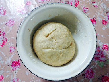 Тесто получается однородным, мягким, податливым, слегка липнущим к рукам. Накройте миску с тестом полотенцем и оставьте в теплом месте на 70-80 минут для подъема.