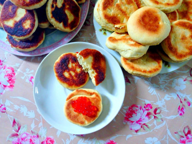Обжаренные пышки получились более румяные и мягкие. Пышки из духовки немножко жестче, но, по всей видимости, менее калорийные. И те и другие достаточно пышные. Вкус у них нейтральный (сахара я положила три столовые ложки вместо двух), немного похож на хлебный. Подавала такие пышки со сметаной и красной икрой.