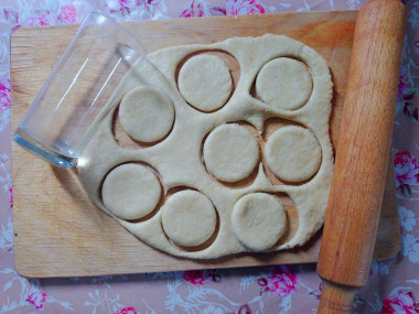 Раскатывается тесто очень легко. Оно абсолютно нелипкое, так что даже не пришлось присыпать рабочую поверхность мукой. Заготовки для пышек вырезала стаканом диаметром 5,5 см.