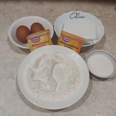 Калорийность продуктов: Творог, Пшеничная мука, Сахар, Разрыхлитель, Яйца, Ванилин, Соль, Молоко