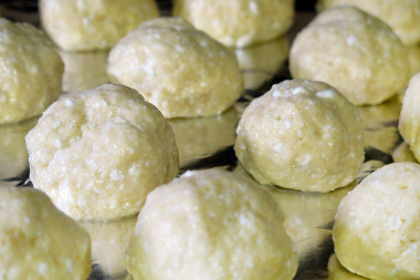 Влажными руками сформируйте из теста небольшие булочки, отщипывая от куска примерно одинаковые кусочки и выложите их на застеленный пергаментом противень на расстоянии друг от друга, так как они в процессе выпекания будут увеличиваться в размере.