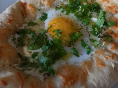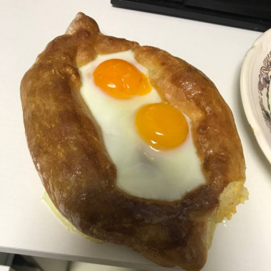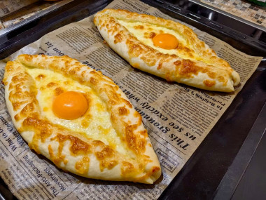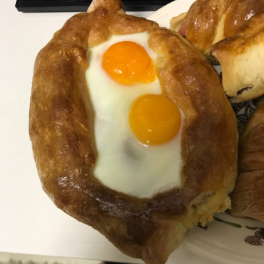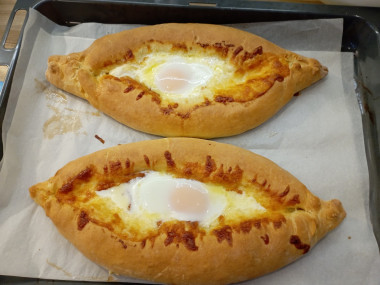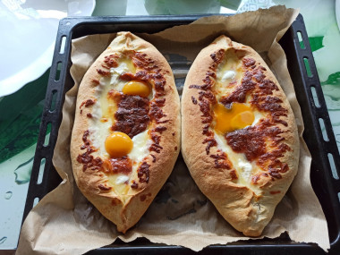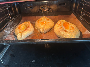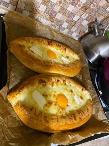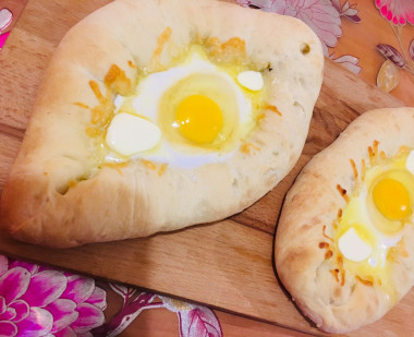 Делала хачапури по этому рецепту, но с некоторыми корректировками. Очень вкусно и красиво! Я положила больше сахара (примерно 1,5 ст.ложки), т.к. я люблю сладковатое тесто. Яиц я брала больше, т.к. этого теста мне хватило на 5 хачапури, я их делала небольшими. А значит 5 яиц на каждое хачапури, плюс ещё одно для смазывания теста. Смазывала тесто я при выпечке не маслом, а желтком. В готовые хачапури вбивала не целое яйцо, а только желток и отправляла ещё на пол минутки в духовку. Белок сразу свернётся и всё испортит. Из белков сделала миндальное печенье.