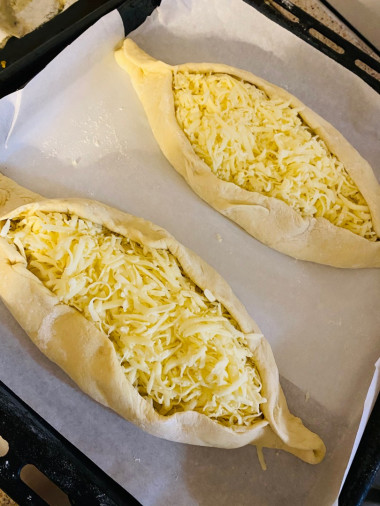 Закрутите края, заворачивая сыр, с обеих сторон. Концы жгутов защипните, а серединку расправьте, формируя лодочку. Аналогичным образом сделайте хачапури из второй части.