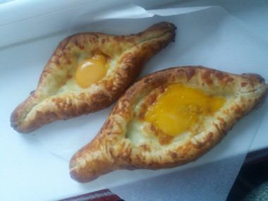 Одного хачапури хватает на две порции. Едят его руками, отламывая кусочки теста и макая их в расплавленный сыр и желток. Приятного аппетита!
