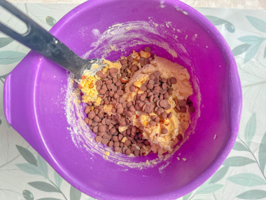 Тесто липковатое и вязкое. Добавьте в тесто шоколад и измельченный орех, перемешайте ложкой.