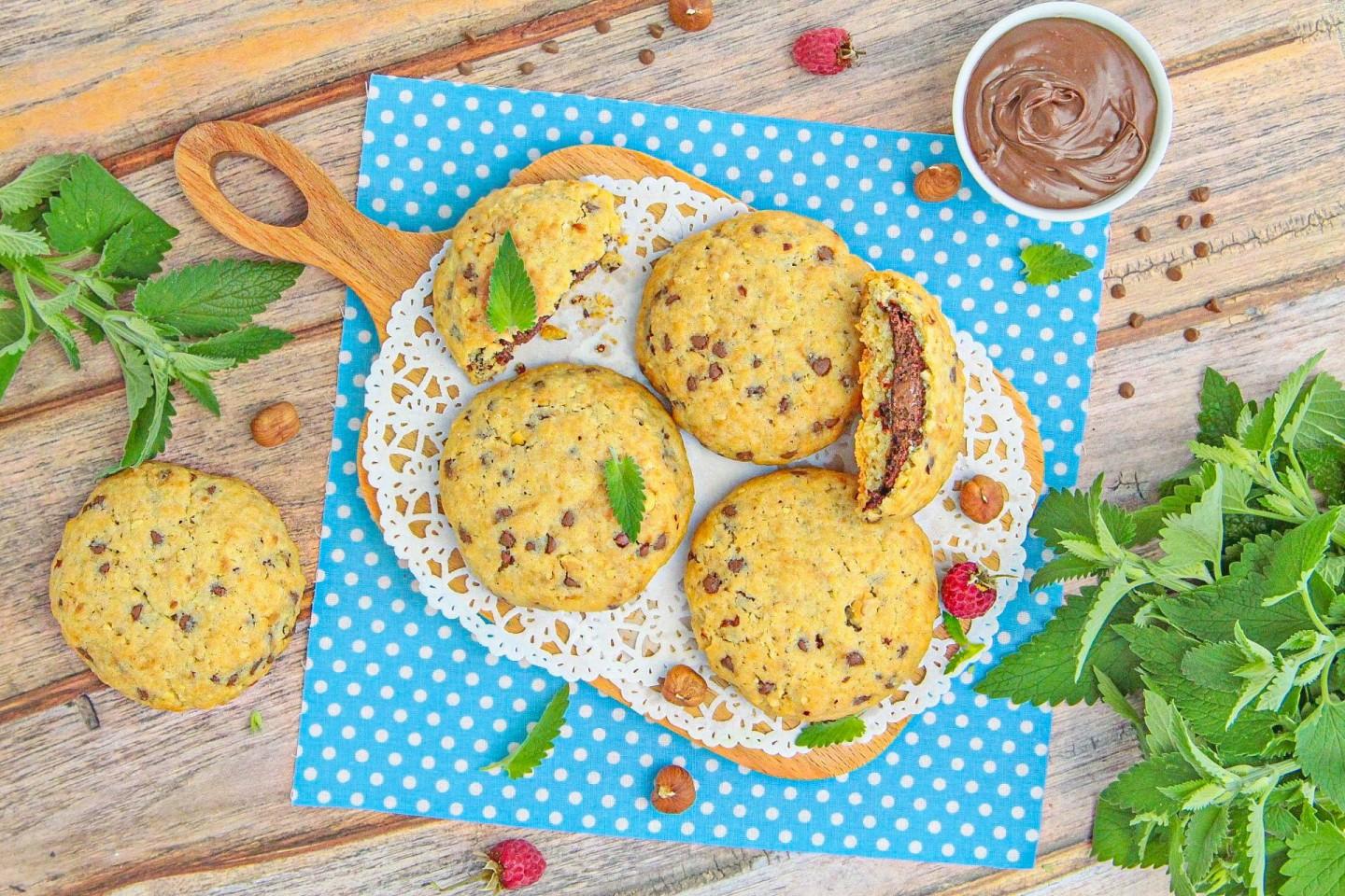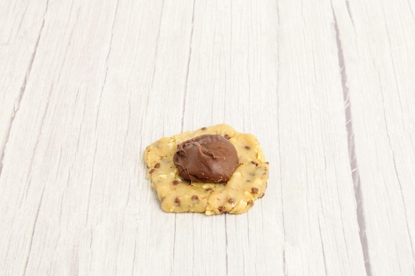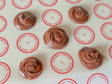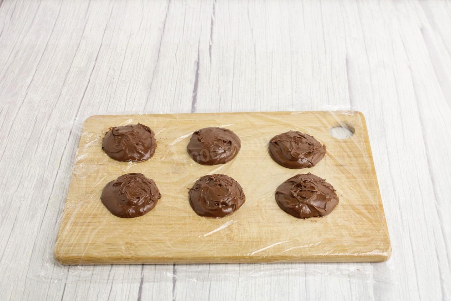 Подготовьте начинку для печенья. Ее нужно предварительно заморозить. Ровную поверхность застелите пищевой пленкой. Шоколадно-ореховую пасту выложите круглыми порциями с помощью ложки либо кулинарного мешка. Размер и количество порций начинки будет зависеть от количества печенюшек. Уберите начинку в морозильную камеру до застывания.