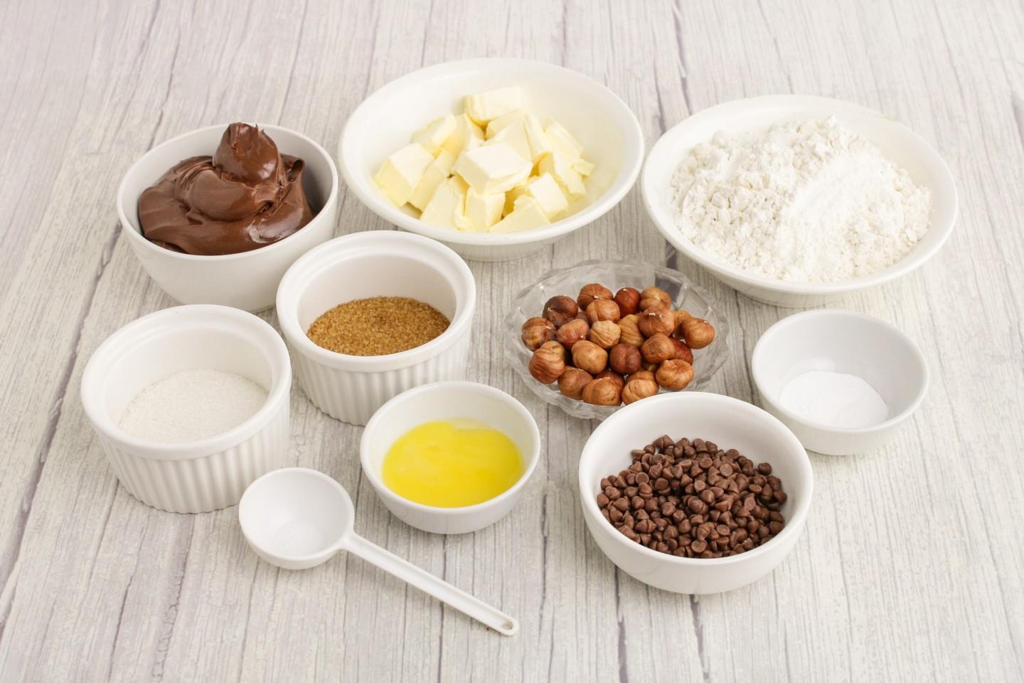 Как сделать американское печенье кукис? Отмерьте необходимые ингредиенты. Сливочное масло заранее достаньте из холодильника, оно должно быть мягким, комнатной температуры. Шоколад можно использовать молочный или темный. У меня шоколад в каплях, можно порубить обычный шоколад на некрупные кусочки.