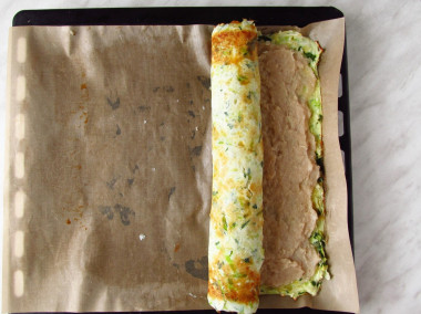 Запекайте капустную основу для рулета в заранее разогретой до 180 С духовке 10-15 минут. Когда краешки коржа подрумянятся, достаньте его из духовки. Время и режим приготовления могут отличаться от указанных, ориентируйтесь на особенности работы своей духовки.
