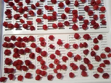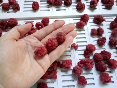 За счет того, что ягоды малины изначально были крепкие и сухие, они не слипаются при заморозке и держат форму. Замороженные ягоды свободно перемещаются по подносу. Теперь их можно расфасовать.