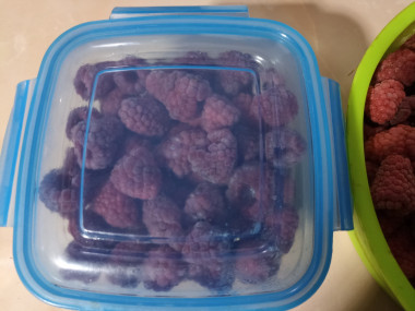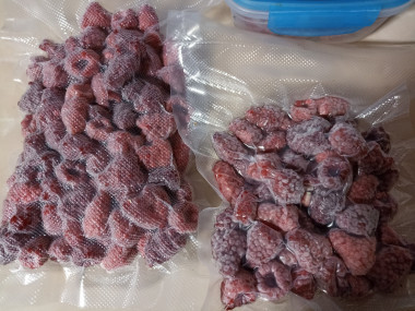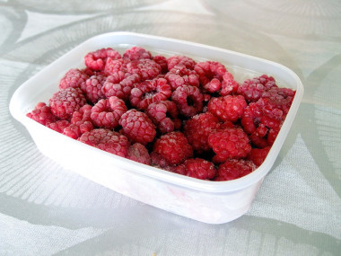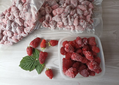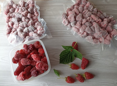 В саду спеют ягоды, обязательно нужно сделать малину замороженную на зиму. Свежесобранные ягоды разложила на пластиковые подложки в один слой ( ягоды сухие, даже не понадобилось ничем застилать подложки ). Оставила в морозильной камере до утра. Утром часть ягод положила в контейнер, часть с помощью вакууматора закрыла в пакеты. Раньше я свежие ягоды сразу раскладывала по контейнерам или по пакетам, а этот способ максимально сохраняет ягодки целиком. Спасибо за рецепт, Юлия!