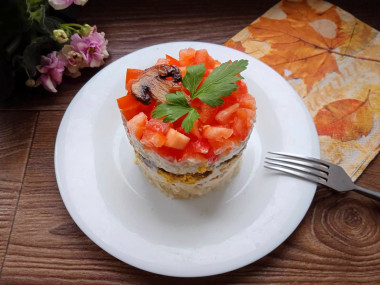 Очень мне понравился салат с копчёной курицей и жареными грибами шампиньонами. Решила приготовить салат, взяв этот рецепт за основу. Вместо огурца взяла помидор, а также добавила натертый твердый сыр. Копчёную курицу заменила отварным куриным филе. Кулинарного кольца у меня нет, я обрезала пластиковую бутылку и выкладывала салат слоями в самодельное кольцо. Шампиньоны обжарила с луком до золотистости. Сваренные вкрутую яйца разделила на белки и желтки. Слоя промазывала майонезом. Сначала положила курицу, потом желтки, следом жареные шампиньоны с луком, после белки, сыр и помидор. Украсила жареным грибочком и петрушкой. Салат пропитывался в холодильнике минут 40, затем аккуратно сняла самодельное кольцо и красота!