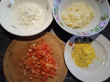 Лук очистите от шелухи, ополосните и мелко нарежьте. Шампиньоны промойте в проточной воде и нарежьте. На горячую сковороду налейте немного растительного масла и обжарьте шампиньоны с луком 5-6 минут. Немного посолите и посыпьте молотым перцем. За время жарки шампиньоны уменьшатся в размере. Обжаренные грибы остудите. О том, как правильно выбрать масло для жарки и сковороду, читайте в отдельных статьях, ссылки в конце рецепта.