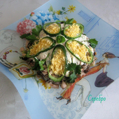 Салат выглядит шикарно. Он очень аппетитный и ароматный, и сытный. Все ингредиенты идеально сочетаются. Нежная курочка с ароматными грибочками в дополнении яиц, сыра и свежего овоща делают своё дело. Безумный вкус!