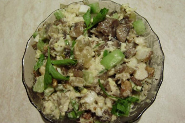 Очень сытный и вкусный салат грибы лук яйца. Интересно, что шампиньоны сырые. Необычно и вкусно, спасибо!