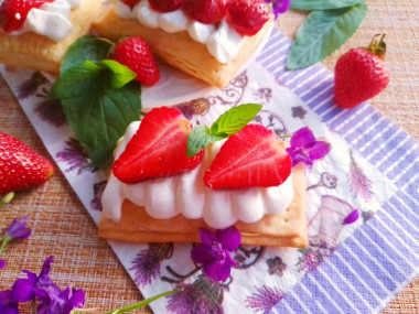 Как сделать бездрожжевую слоеную выпечку с клубникой и кремом в духовке? Подготовьте все необходимые ингредиенты. Сливки берите с высоким процентом жирности, от 33%. сливки и посуда в которой они будут взбиваться должны быть хорошо охлажденными. Если у вас слоеное тесто замороженное, то заранее достаньте его из морозилки.