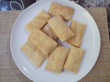 Возьмите бездрожжевое слоеное тесто. При желании можете сделать слоеное тесто самостоятельно, ссылка на каталог рецептов есть в конце этого рецепта. Рабочую поверхность присыпьте мукой, выложите тесто. Отрежьте часть слоёного теста, слегка его раскатайте скалкой и нарежьте на равные кусочки. Сделайте на каждом кусочке проколы вилкой по всей поверхности. Это нужно для того, чтобы тесто сильно не вздулось во время выпечки.