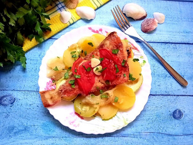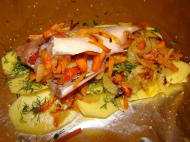 А вот еще один вариант запекания морского окуня с картошкой, помидорами, болгарским перцем.