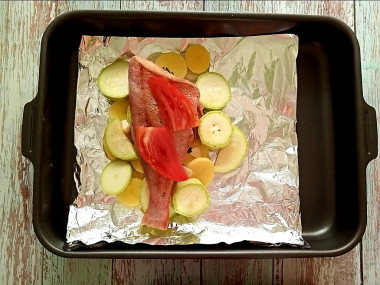 Заверните рыбу с начинкой аккуратно в фольгу так, чтобы сок при запекании не вытекал. Поставьте рыбу с овощами в разогретую до 200ºС духовку примерно на 30-50 минут. Точное время и температуру запекания определяйте по своей духовке. О работе духовок читайте по ссылке, в статье в конце рецепта.