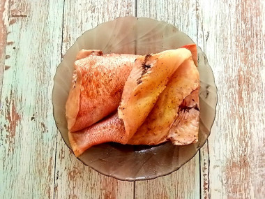 Нашла на сайте замечательный рецепт рыбы в фольге запеченной с овощами в духовке. У меня было две тушки морского окуня примерно по 250 г. каждая. Почистила их и срезала все плавники, т. к. они очень острые. Рыбу надрезала, сделав своеобразную книжечку. Внутри и снаружи присыпала приправой для рыбы и сбрызнула лимонным соком.