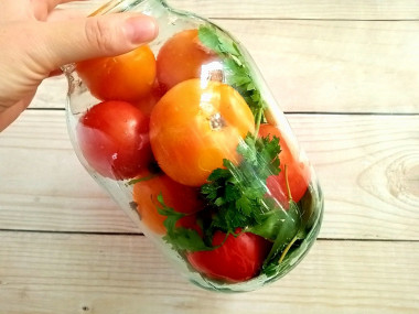 Отправьте в банку помидоры и оставшуюся петрушку.