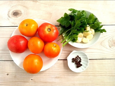 Помидоры и петрушку вымойте. Чеснок очистите от кожуры и ополосните. Количество чеснока, как и петрушки можно регулировать по вкусу.