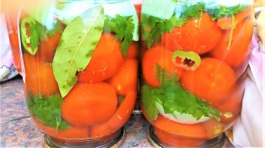 Сделала помидоры на зиму с петрушкой по этому рецепту. Я использовала банки объемом 2 литра, количество компонентов для заливки увеличила. Когда сливала горячую воду с банки, получилось около литра жидкости. Заливала один раз, т. к. мои помидоры домашние с тонкой шкуркой. Мне понравился способ насыпать соль и сахар прямо в банку, сыпучие ингридиенты хорошо растворяются в кипятке). Для измерения пользуюсь всегда одной ложкой, на этот раз насыпала с небольшой горкой. Кроме петрушки все же добавила по листочку вишни и черной смородины для аромата. Готового уксуса у меня не было, развела эссенцию, воспользовавшись специальным калькулятором сайта.