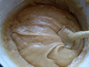 Начните порциями всыпать в массу муку, перемешивая ее сначала венчиком, а затем, когда тесто станет гуще, ложкой. В отличие от классического торта, тесто в этом не густое, его нельзя раскатать скалкой, так и надо.