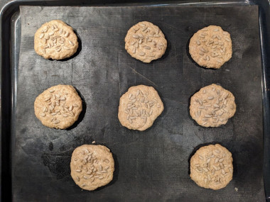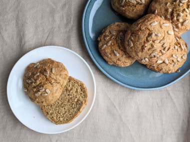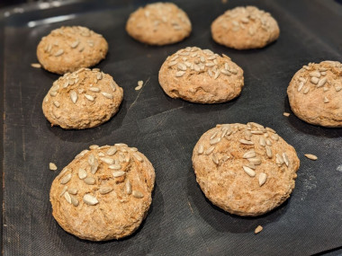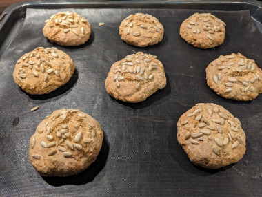 Кефир с лёгкостью заменила на сыворотку, поскольку её у меня было много. И тесто от этого хуже не стало) Очень быстро, в 2 приёма замешала тесто. Получилась консистенция, из которой можно лепить. Смазала руки растительным маслом и слепила 8 шариков по 65 г. Выложила на тефлоновый коврик и присыпала семечками. Булочки выпекались быстрее, чем целый хлеб. Около 20 мин.