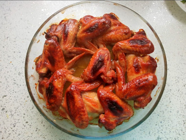 Полейте крылья маринадом и оставьте мариноваться прямо в форме 15-20 минут. За это время можете прогреть духовку до 200ºС (точную температуру и время определяйте, руководствуясь особенностями своей духовки!). Поставьте форму с крылышками в духовку на 45 минут. В процессе выпекания проверяйте блюдо. Если нужно, разворачивайте его другой стороной, перемешивайте, поливайте верх мяса соусом со дна.
