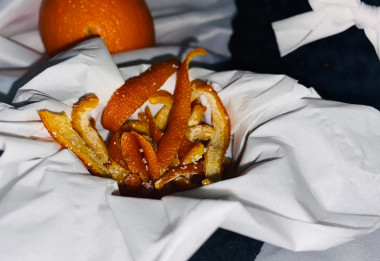 Цукаты из апельсиновых корок на пробу сделала на 2 порции, а это из одного апельсина. Апельсин съела, а кожуру порезала на полосочки, а не выбросила в мусорку, как обычно