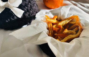 Откиньте цукаты из апельсиновых корок на ситечко, чтобы максимально стек сироп, затем разложите для просушивания на листе пергаментной бумаги. Подсушивать их можно в духовке при 50 градусах, либо при комнатной температуре 1-2 дня. Главное не пересушить цукаты. Готовые цукаты гибкие и не прилипают к рукам.