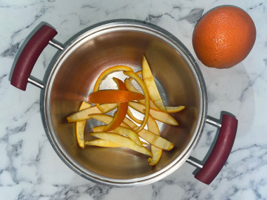 Очень тщательно, возможно, с применением жесткой щеточки или даже соды, почистите поверхность апельсинов. Кожуру чистых апельсинов надрежьте при помощи острого ножа на 4-8 сегментов и аккуратно отделите кожуру от сочной мякоти. Нарежьте апельсиновую кожуру продольными полосочками и поместите их в кастрюльку подходящего объема. Воду наливайте так, чтобы она покрывала кожуру. А соль нам понадобится для того, чтобы убрать горечь.