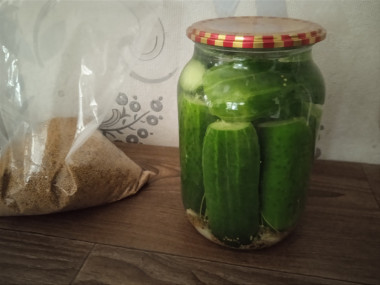 Огурчики я предварительно замачивала в воде на 2 часа, чтоб они имели хрусткость. Положила в стерильные банки на дно укроп, семена горчицы и чеснок по описанию в рецепте. Уложила вымытые огурчики, отрезав края. Два раза заливала кипятком банки с огурчиками и оставляла на указанное в рецепте время. После добавила все специи по списку, залила огурцы кипящим маринадом и закатала.