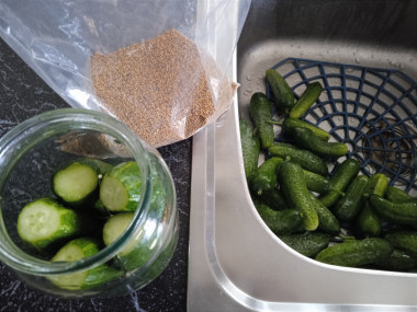 Перед приготовлением огурцы замачивают в воде. Это нужно для того, чтобы восстановить в них водный баланс. Здесь все индивидуально: если огурцы были сорваны сутки назад, оставлять их в воде нужно на 2-3 часа, а если сорваны пару часов назад - достаточно и полчаса.