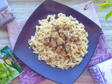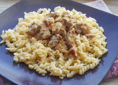 Решила приготовить пасту с мясом по этому рецепту. Свинину нарезала и отправила жариться на горячую сковороду с чесноком. Через 20 минут я добавила муки и перемешала.Затем налила вина и положила сметаны, посолила и добавила итальянские травы. Все быстро перемешала чтобы не было комочков. Тушила ещё 10 минут, получилось невероятно ароматно, мясо в небольшом количестве соуса. Отварила макароны в подсоленной воде и откинула на дуршлаг. После того как стекла вся вода, я отправила макароны обратно в кастрюлю. Добавила столовую ложку оливкового масла и перемешала. После такой процедуры макароны точно не слипнутся, даже если постоят. Разложила по тарелкам, сверху выложила мясо и присыпала сыром. Получилось полноценное блюдо - и сытно и вкусно!