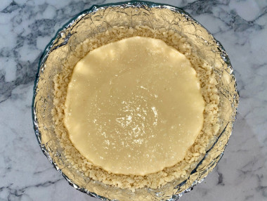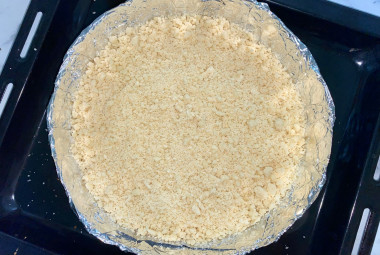 Форму для выпекания пирога смажьте сливочным маслом. Высыпьте в нее две трети части теста-крошки, сделайте руками бортики. В середину выложите творожную массу, аккуратно разравнивая ее ложкой до бортиков.