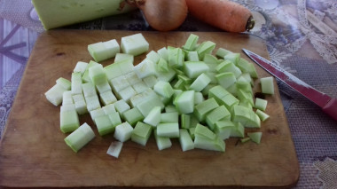Промойте кабачки и при желании срежьте с них кожуру. Я этого не не делала. Кабачки у меня молоденькие, сразу с грядки, поэтому не понадобилось очищать их от кожицы или удалять твердые семечки, просто нарезала их кубиками и отправила на сковороду с растительным маслом обжариваться. О том, как подобрать идеальную сковороду, а также как правильно выбрать растительное масло, читайте в отдельных статьях, ссылки в конце рецепта.