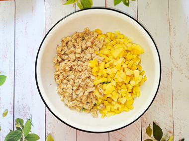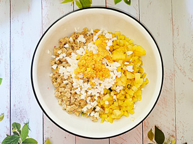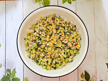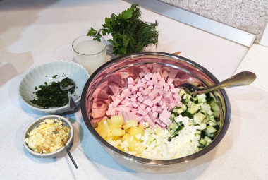 Сложите все нарезанные ингредиенты в миску, туда же добавьте растертые с горчицей желтки. Посолите и поперчите окрошку по вкусу, перемешайте. Такую окрошечную основу вы можете приготовить в большом объеме и убрать в холодильник. А подавать, заливая айраном, необходимое количество.